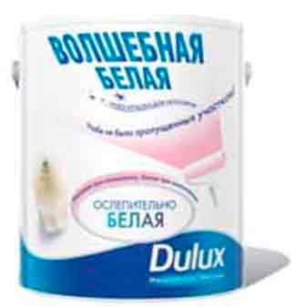 ОСЛЕПИТЕЛЬНО БЕЛАЯ МАТОВАЯ ВОДОЭМУЛЬСИОННАЯ КРАСКА DULUX MAGIC WHITE (“ВОЛШЕБНАЯ БЕЛАЯ”) является высококачественной быстросохнущей краской, созданной для окрашивания потолков.Она изготовлена на основе эмульсии акриловых сополимеров c применением экологически чистых светостойких пигментов. КРАСКА DULUX MAGIC WHITE (“ВОЛШЕБНАЯ БЕЛАЯ”) имеет матовый блеск и не имеет запаха. Она применяется для большинства внутренних поверхностей (бетон, штукатурка, ГИПСОКАРТОН и т.п.). КРАСКА DULUX MAGIC WHITE (“ВОЛШЕБНАЯ БЕЛАЯ”) превосходно ложится на поверхность, не допуская разбрызгивания. Особенность этой краски в том, что при нанесении она имеет розовый цвет, а при высыхании становится ослепительно белой. Это является большим преимуществом и помогает не оставлять при окрашивании непрокрашенных участков. КРАСКА DULUX MAGIC WHITE (“ВОЛШЕБНАЯ БЕЛАЯ”) будет хорошо смотреться и долго служить на потолках в гостиных, кухнях, спальнях, детских комнатах, залах, кабинетах и других сухих помещениях.